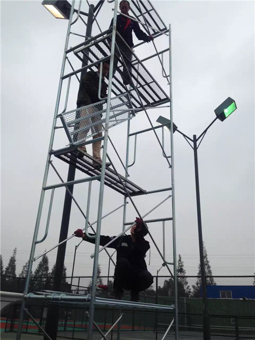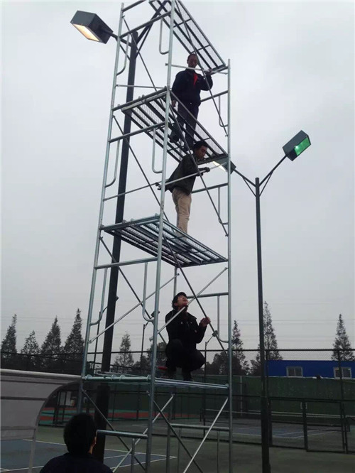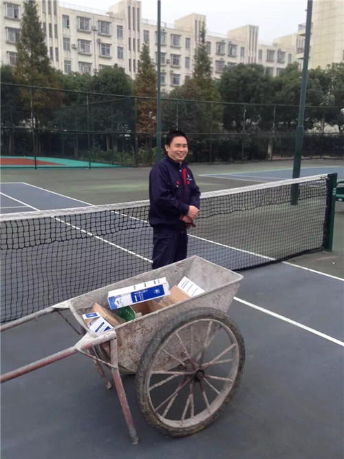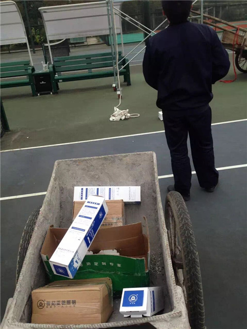 网球场上照明终于正常,满意的笑容瞬间绽放
